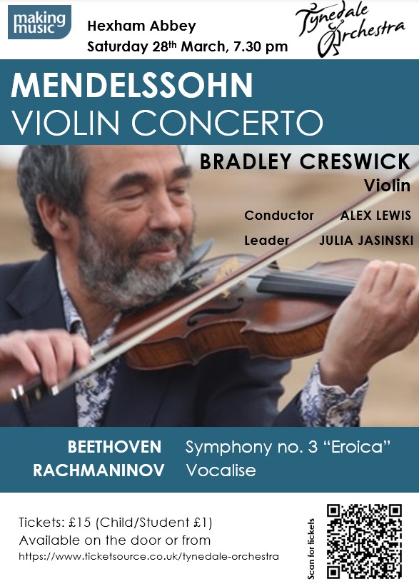 Join us for an uplifting evening featuring Mendelssohn’s Violin Concerto with the wonderful local soloist Bradley Creswick, plus Beethoven’s powerful Eroica Symphony and Rachmaninov’s beautiful Vocalise. A memorable night of great music in the heart of Hexham.